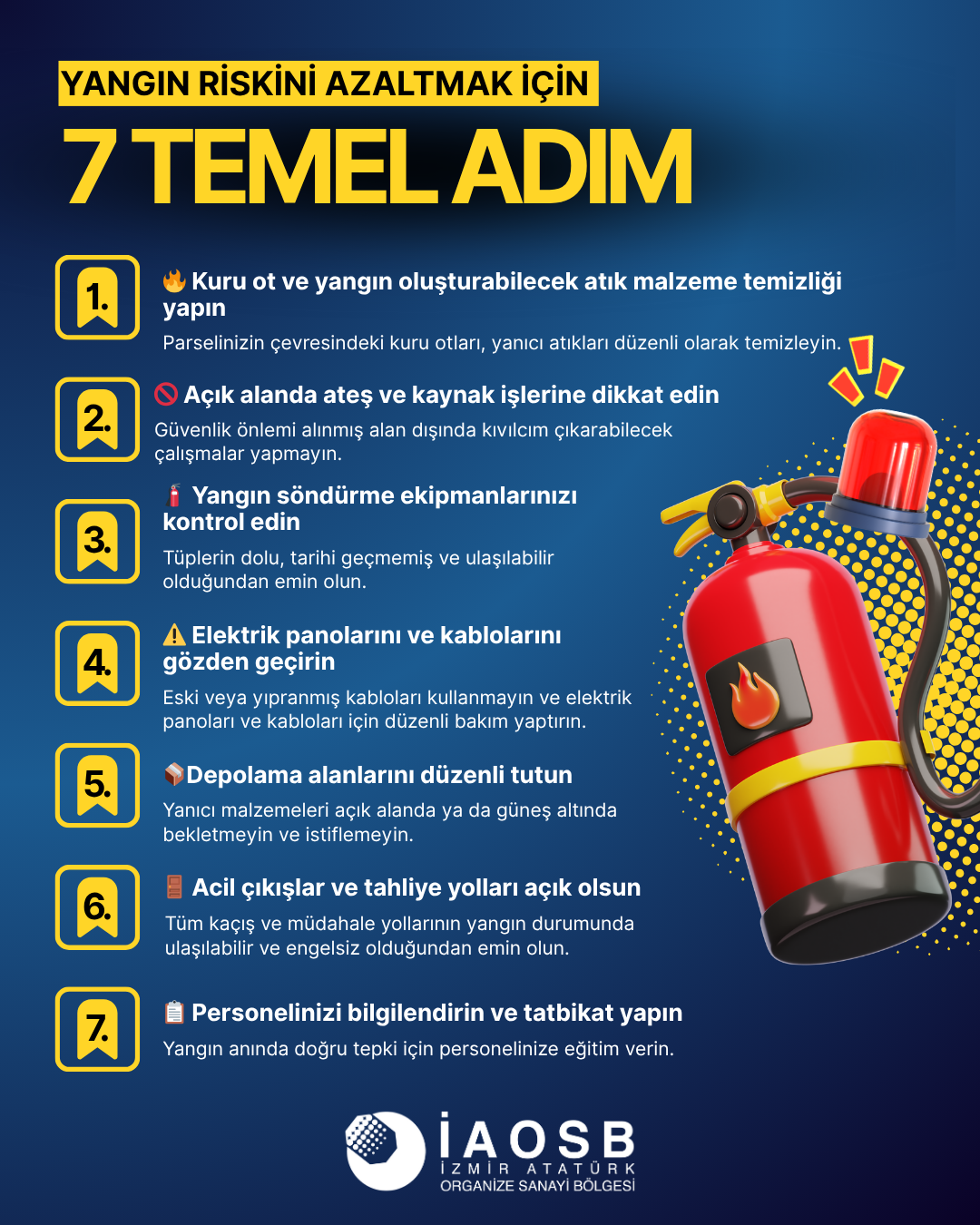 Bu nedenle; sanayi parselinizin sınırları içinde yer alan kurumuş yabani otların, yanıcı özellikteki hurda malzemelerin ve paletlerin ivedilikle temizlenmesi hem işletmeniz hem Bölgemiz için önem arz etmektedir.